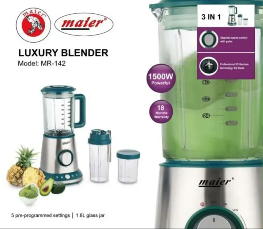 مخلوطکن سه کاره مایر مدل MR-142 با توان 1500 وات یکی از قدرتمندترین مدلهای موجود در بازار است. این دستگاه با برخورداری از مخلوطکن، خردکن و آسیاب، یک مجموعه کامل برای آشپزخانه به شمار میآید.
