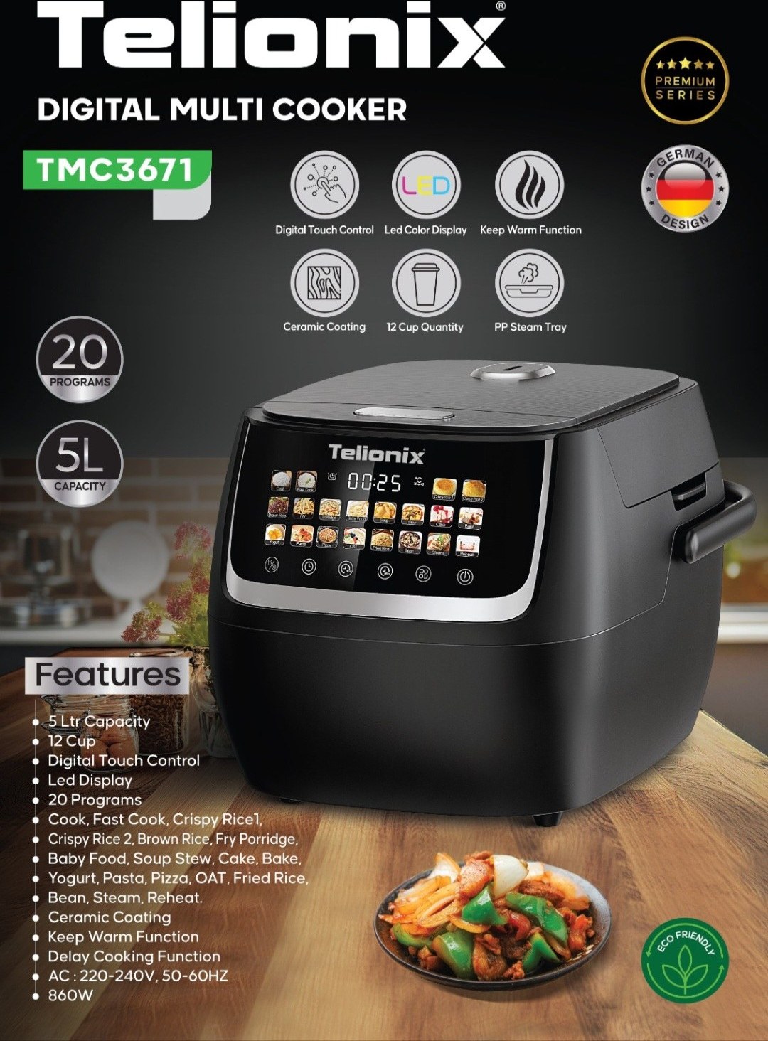 تجربه خریدار: «با پلوپز تلیونیکس TMC3671 دیگر نگران پخت برنج یا انواع غذاها نیستم. صفحه نمایشگر LED و کنترل لمسی باعث شده کار با دستگاه بسیار ساده و لذتبخش شود. کیفیت پخت عالی و گرم نگهداشتن طولانی، واقعا کاربردی است.»